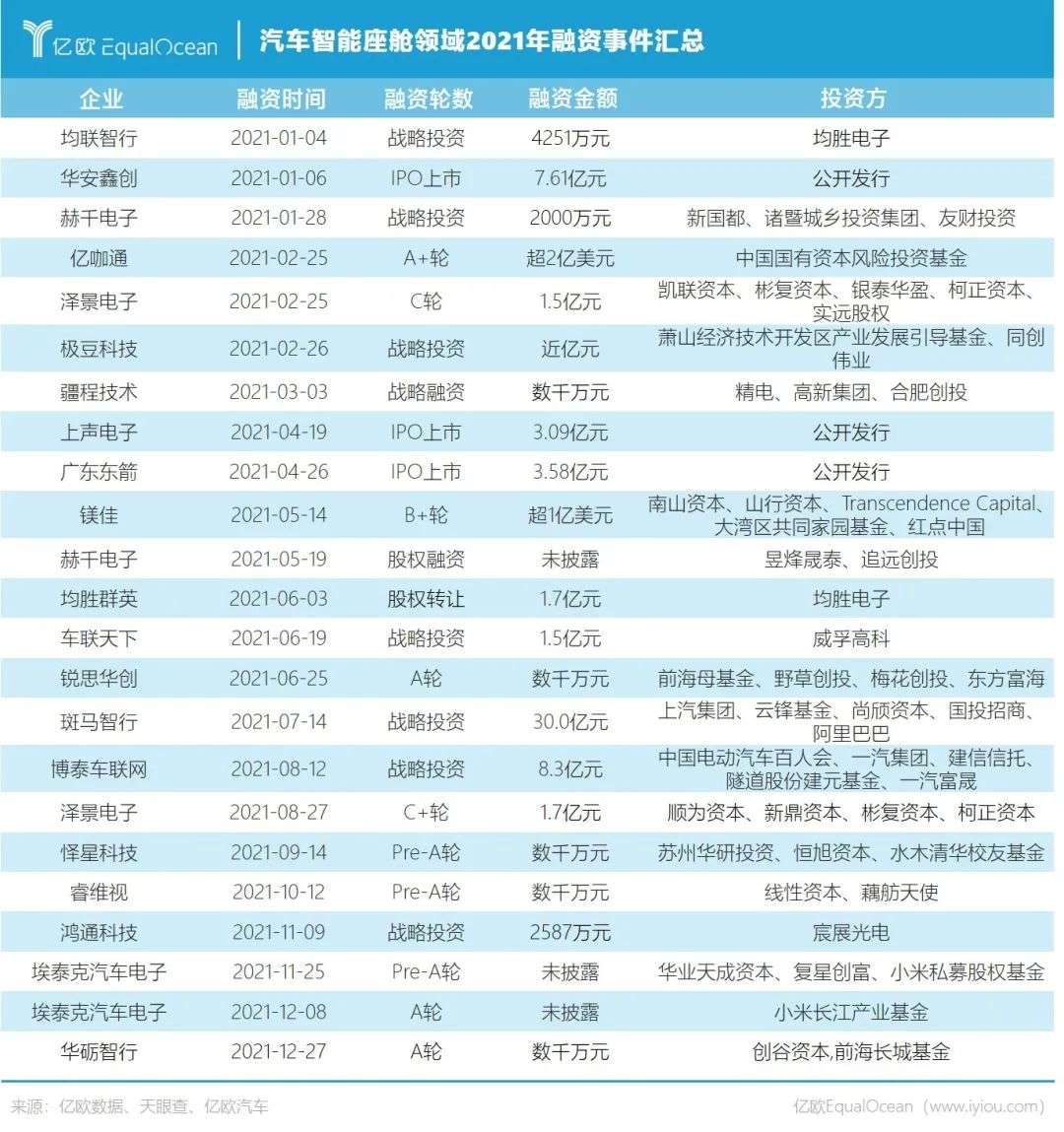 据亿欧汽车统计,2021年,智能座舱市场共发生投融资事件23起;