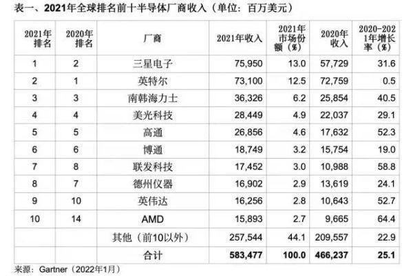 首屈一指的便是韩国三星电子。据美国调研公司Gartner近期发布的半导体厂商2021年营业收入排行榜显示,以存储器为主力产品的韩国三星电子超过美国英特尔,自2018年以来再次跃居首位。