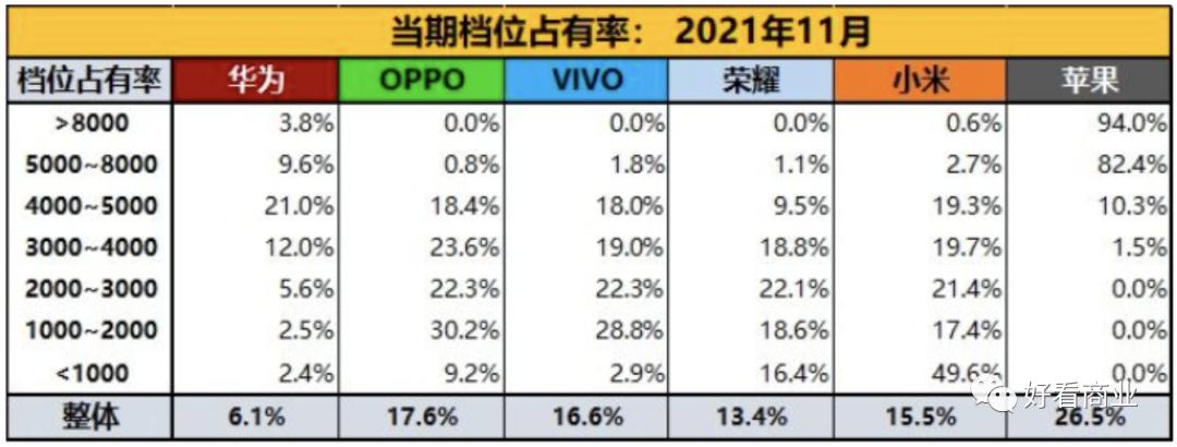 以11月份为例,5000-8000元区间,苹果占比82.4%;8000+以上的市场苹果份额更是高达94%,无人能敌。国产智能机品牌主要还是在中低价位断争夺。