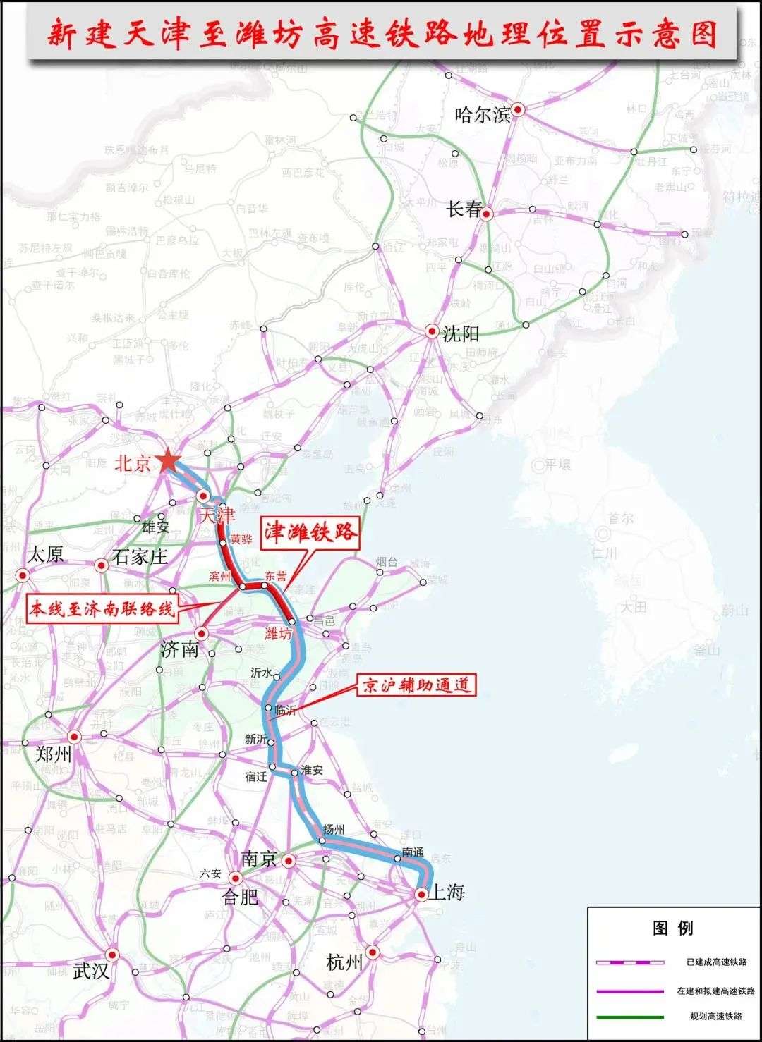 从最新批复来看,津潍高铁起自京津城际铁路延伸线滨海站,经天津滨海新区、河北沧州、山东滨州、东营、潍坊,终至济青高速铁路潍坊北站,约348.9公里,设站10座。设计时速为350公里/小时,远景规划输送能力为单向4500万人/年。