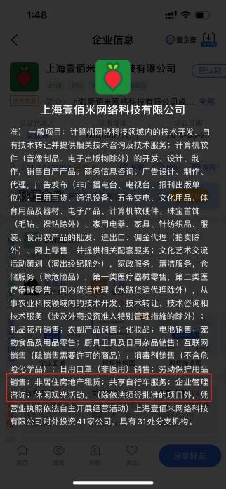 叮咚买菜则试图打破单一的客群限制,准备从其他领域获得更大的上行空间。据爱企查数据显示,叮咚买菜运营主体上海壹佰米网络科技有限公司,其经营范围新增共享自行车服务,企业管理咨询和休闲观光活动等,公司注册资本也由35亿元增至80亿元,同比增长128.6%。
