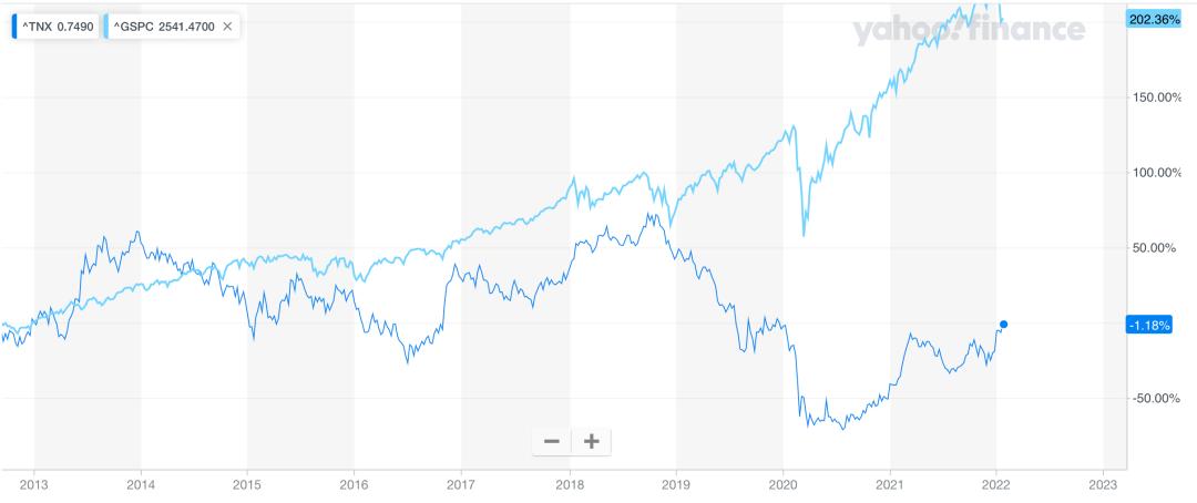 我们首先整理了十年来美国十年国债收益率与标普500指数的走势的情况,见下图