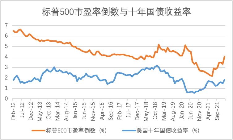 在此我们引用一个概念“市盈率倒数”, 即股价与每股收益的比值,再用此与美国十年国债收益率进行对比,见下图