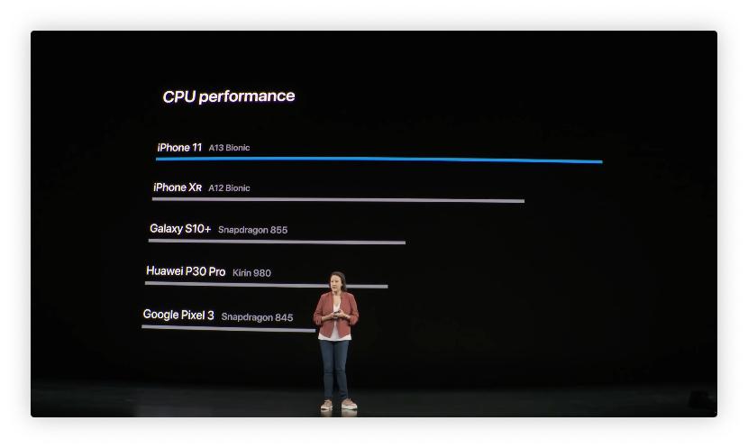 2019年苹果更是首次在发布会上拿出了三星、华为和Google的手机用作跑分对比,从而展示自己的强劲性能。虽然在图表上,苹果的A13仿生芯片领先了同行一大截,但这样的对比对苹果来说无异于《人间宣言》,它意味着“苹果不是高高在上的模范手机,苹果也是可以被超越”。