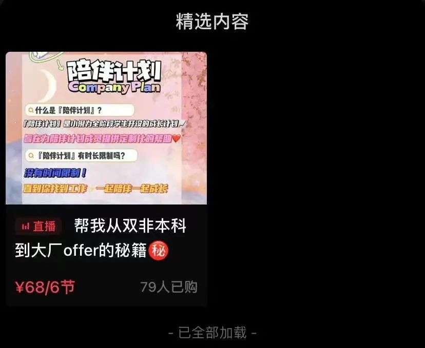 一位就职于字节跳动的实习生(粉丝 1.9 万),同样也在售卖名为「陪伴计划」的指导课程,课程内容包括“如何规划大学生活”、“如何写简历”、“教授面试技巧”等等。虽然客单价较低为 68 元,但已经有 79 人购买,收益也能有 5000 多元。