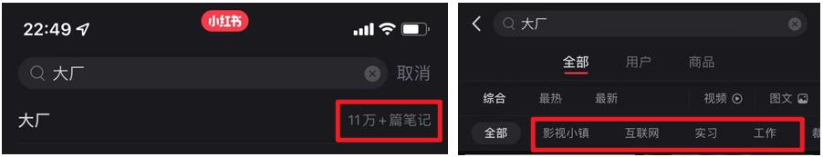 在小红书上搜索“大厂”,能看到已经有 11w+ 篇笔记;在结果页,显示有多个与“大厂”有关的 tag 如“互联网”、“实习”、“工作”等等。