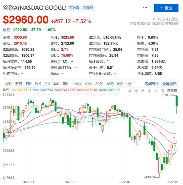 值得关注的是,谷歌宣布将在今年7月实行“1拆20”的拆股计划——单股股价将从近3000美元下将至150美元左右,此前股价过高的限制因素消除后,谷歌将迎来更多中小投资者的关注和交易,其市场表现有望继续攀升——在业绩稳健的基础上。受此影响,谷歌股价于2日盘后大涨超9%,并在2月3日再度以大涨7.52%收盘。截至发稿,谷歌股价为2960美元,市值1.96万亿美元。