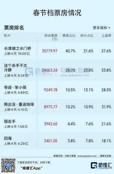 春节档首日以试探为主,除了《水门桥》之外,《奇迹·笨小孩》、《四海》、《这个杀手不太冷静》的排片分别为21.4%、16.6%、14.7%,并未拉开太大差距。
