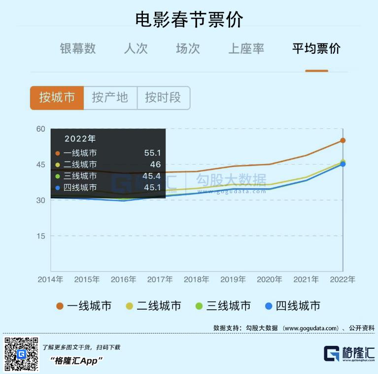 分地区来看,一线城市涨价最狠,从49.3元涨到70.8元,涨幅高达44%。三四线城市稍显温和,也有20%左右的涨幅。单从票价来看,一线飙升、三四线直追一线,膨胀速度远超物价涨幅。