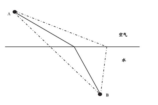 如果光走左边的那条直线,虽然看起来距离最短,但由于水下的距离更长,而光在水中的速度较慢,所以全程耗时反而更长;如果光走最右边那条线,水下的距离较短,但全程太长了,耗时还是更长。