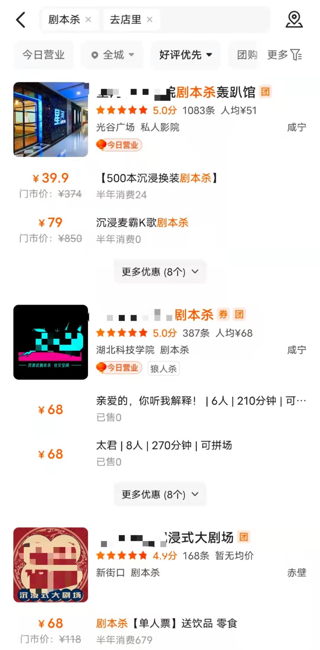 通过在第三方的剧本杀预订平台上可以看到,咸宁大部分的剧本杀门店优惠团购订单几乎为0,好一点的剧本杀门店消费订单也仅仅两位数,如果按一单40元的售价算,也就800元,很难维持一家门店的正常运营。