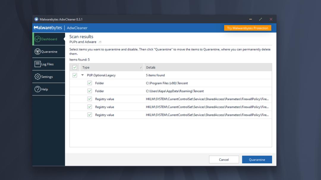 AdwCleaner 由老牌安全公司 Malwarebytes 开发,免费开放给公众使用。麻雀虽小,五脏俱全。它主要的作用是比对云端数据库,删除本地的各类恶意软件,某些应用注册的弹窗程序、在注册表做的小动作它也能检测出来并删除。