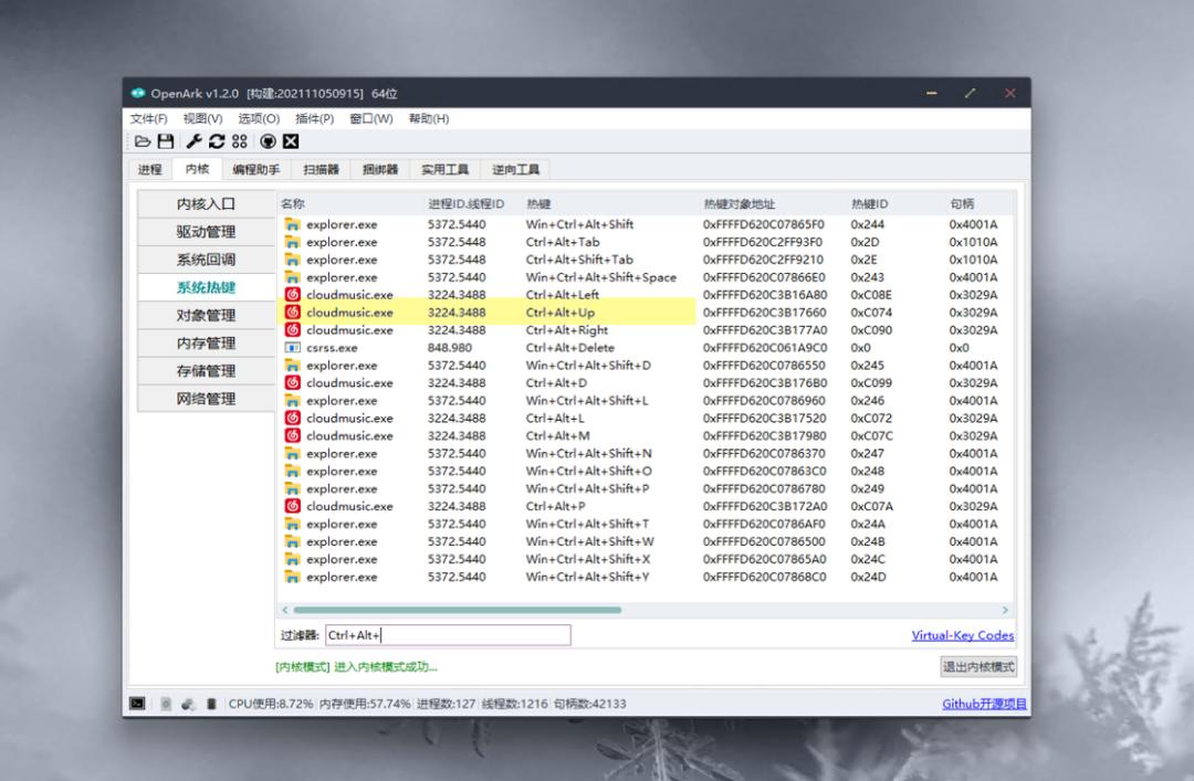 想要知道究竟是哪个应用占用了快捷键,可以打开 OpenArk,进入 内核 > 系统热键 界面,然后选择 进入内核模式。