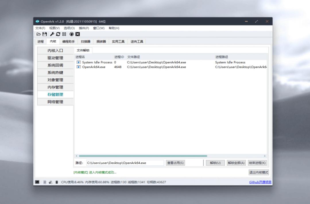 与快捷键被占用的情况类似,我们偶尔也会遇到某些文件无法打开,无法删除的情形。这大概率是因为该文件正在被其他应用使用。OpenArk 同样为此情况提供了解决方案:进入 内核 > 存储管理界面,选择 进入内核模式,键入文件路径,点击查看占用,应用便会展示所有使用了该文件的进程。之后,利用界面右下侧的解锁选项便能再次自由操作此文件了。