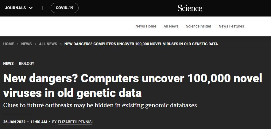 1月26日,科学家在Science上发文,题为《新危险?计算机在原有基因数据中发现10万个新病毒》,指出关于未来疫情的线索可能隐藏在现有基因数据中。