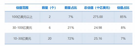 杭州独角兽企业总估值超过3千亿美元,平均估值超百亿美元。整体估值分布不均:72%独角兽企业估值低于30亿美元,仅占总估值的7%。