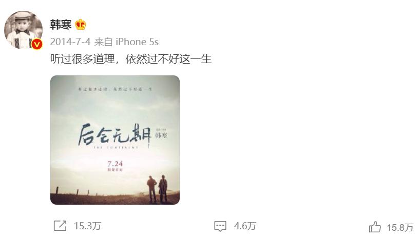 过去因为拥有超高的关注度,因此很多关键的电影物料都发布在韩寒的个人微博上,这是“韩寒品牌”带来的价值。随着关注度的下降,这种价值也逐渐消失。
