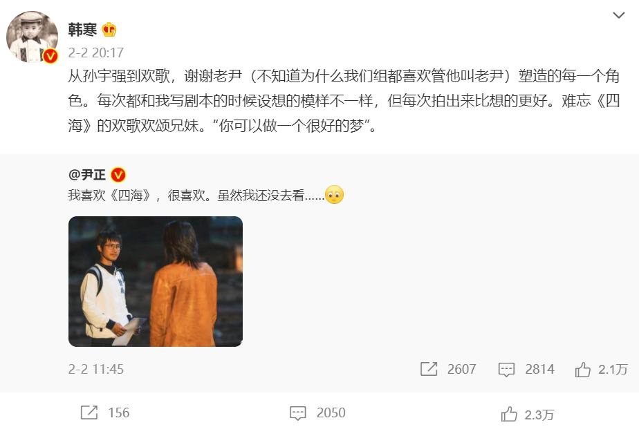 如今,韩寒的微博里主要是商业广告,以及自己或合作伙伴电影的宣传文案。文案的言辞不再犀利,变得谦虚、温和与谨慎,自然也难以聚集起网民围观。《四海》口碑滑坡后,他转发每一个为电影宣传的朋友的微博,放低姿态,感谢对方。
