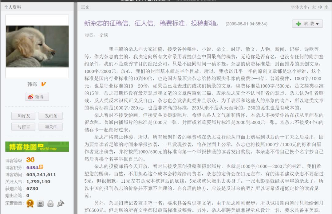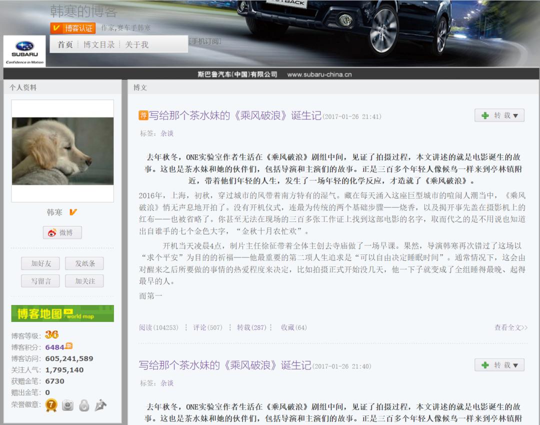 博客时代第一场大型骂战结束后,韩寒的博客也成为了全球点击量最高的博客。