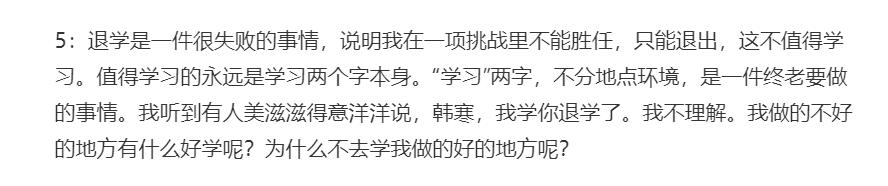 2020年时,韩寒甚至在采访中反思:“过去我花了很多年在杂文、公共事件这些事情上,可能有六七成是对的……但最后写来写去都是在发泄情绪,干货很少。后来你就会变成一个非常鸡贼的人,你会情不自禁地想着,怎么能去挑动最多人的情绪,以获得最大的传播。”所以,当他发现自己有这种倾向的时候,就毅然停止了。