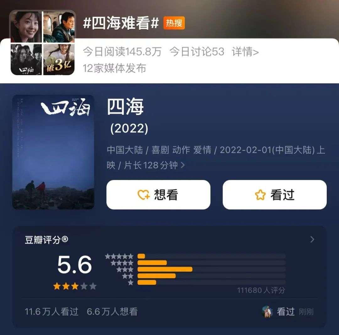 其实从阵容上看,“韩寒+沈腾+刘昊然”的配置很有票房号召力。初一当天,《四海》以2.34亿票房位列春节档票房第二,仅次于《水门桥》。但当天下午#四海难看#登上热搜高位,紧接着豆瓣开分5.6分,是韩寒四部电影作品中分数最低的。很快《四海》票房随着口碑一起滑落,今天的单日票房已经下降到第7位,排在《喜羊羊与灰太狼》大电影之后。