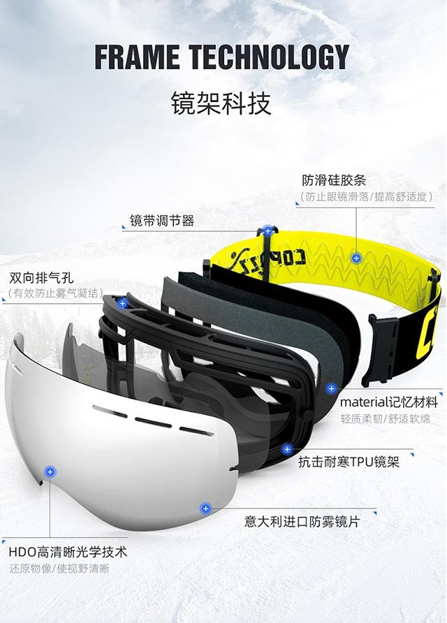 酷破者的产品将前研技术、愉悦体验、潮流设计融为一体。开发的滑雪镜采用了意大利进口的双层镜片,防雾的同时还有高清视野,可防强光和阻挡紫外线。镜框采用memory记忆材料,具有轻质柔韧,结构稳定的特点,佩戴感舒适更贴合面部。镜片可以快速更换,适应不同光线,在夜间滑雪实现快速更换镜片。滑雪镜边框才用无边框大球面的时尚设计,佩戴起来更显脸小。面对国际滑雪镜品牌两三千的价格,酷破者的性价比,给予国内外消费者以诚相待。