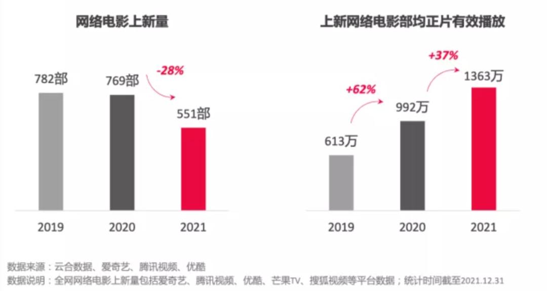 不仅票房纪录没有被刷新,累计分账破千万的影片数量也从2020年的77部下降至68部。此外,根据中国电影家协会网络电影工作委员会联合云合数据、优酷、爱奇艺、腾讯视频等共同发布的《2021中国网络电影行业年度报告》(下称《报告》),2021年上新的网络电影数量骤减至551部,同比下降28%。