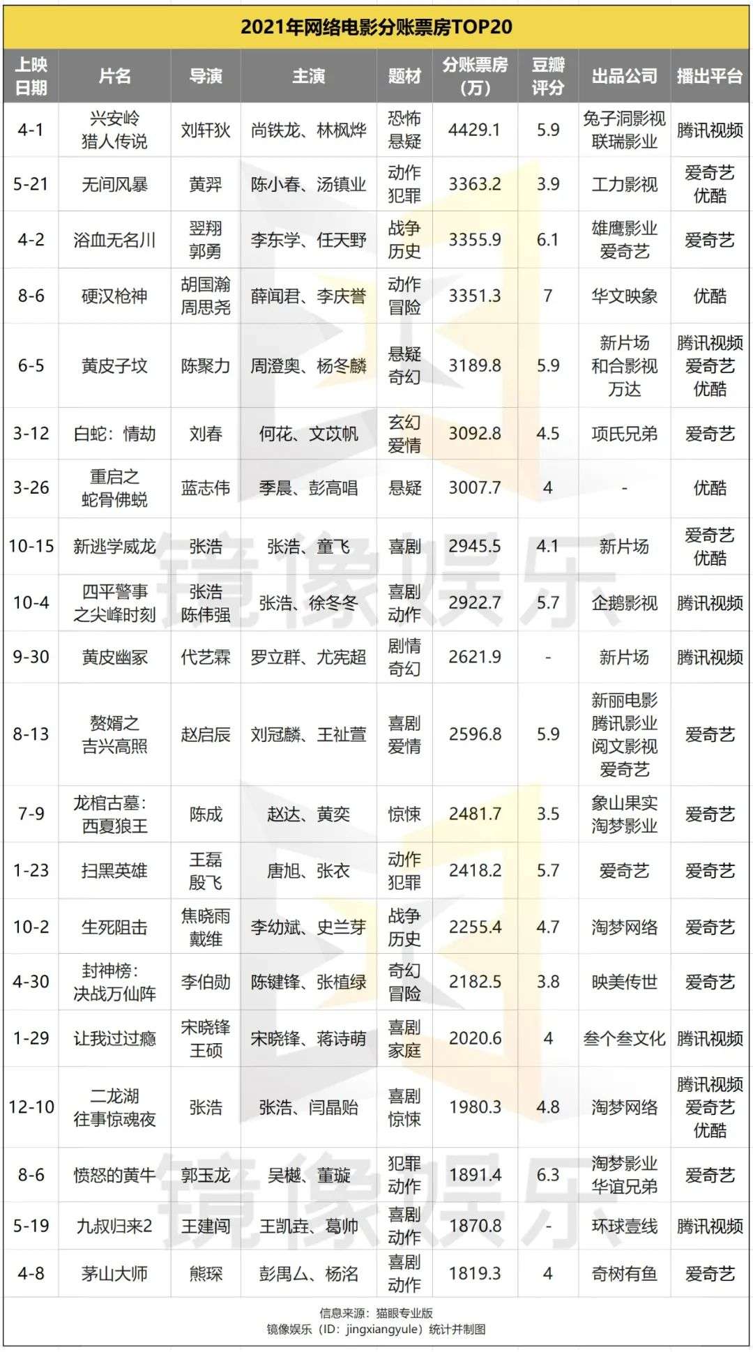 再者,网络电影的快速发展也吸引了很多大厂提前站位。2021年,万达参与出品的《黄皮子坟》、华谊兄弟参与出品的《愤怒的黄牛》都进入票房Top20。