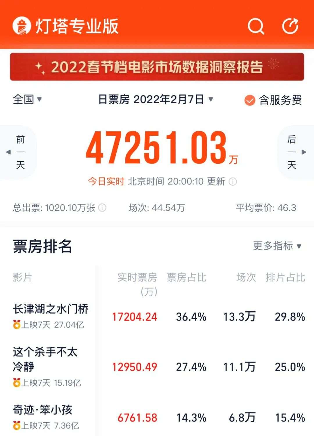 真正开画以后这种格局并未改变。凭借着《长津湖》IP热度延续+高燃的战争场面,《水门桥》首日就斩获6.41亿元的票房,灯塔专业版数据显示,截止2月7日晚8点已经达到27亿元,一路领跑。