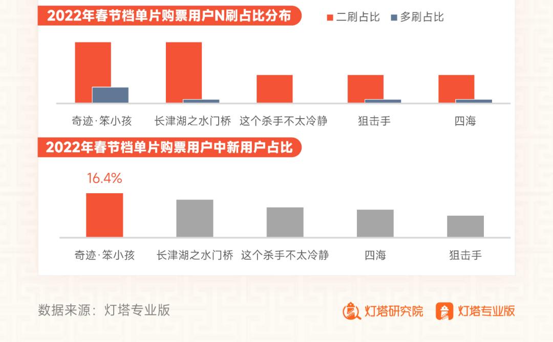 而在二刷方面,《奇迹》与《水门桥》在整体购票用户中二刷率是其他影片的2倍,N刷方面比例远高于其他影片,说明《奇迹》粉丝和核心用户层中颇具影响力。