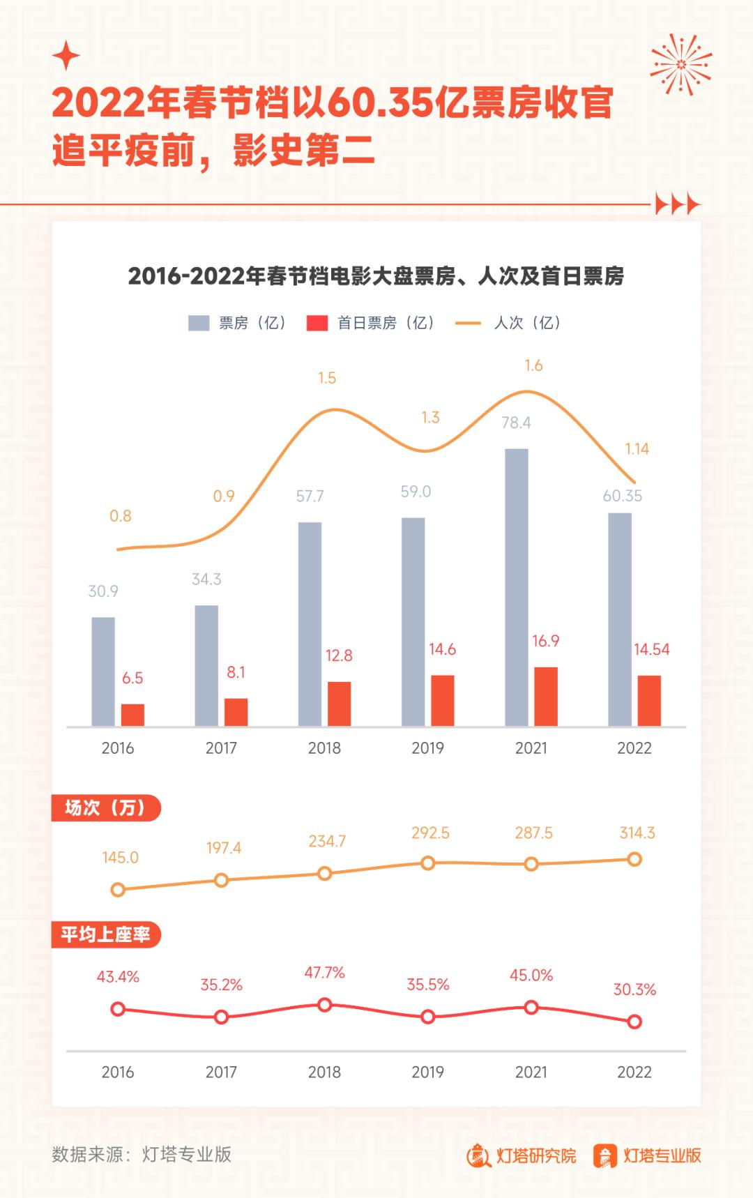 根据灯塔研究院、灯塔专业版发布的《2022春节档电影市场数据洞察报告》(以下简称《报告》)数据显示,在过去的6天长假里,春节档总票房达到60.35亿元,达成了影史第二高纪录,追平疫情前水平(2019年春节档59亿元)。