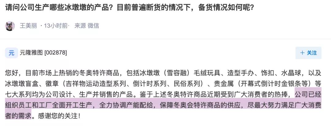 2月7日,元隆雅图在互动易平台上的最新回复显示,公司已经组织员工和工厂全面开工生产,全力协调产能配给,保障冬奥会特许商品的供应,尽最大努力满足广大消费者的需求。