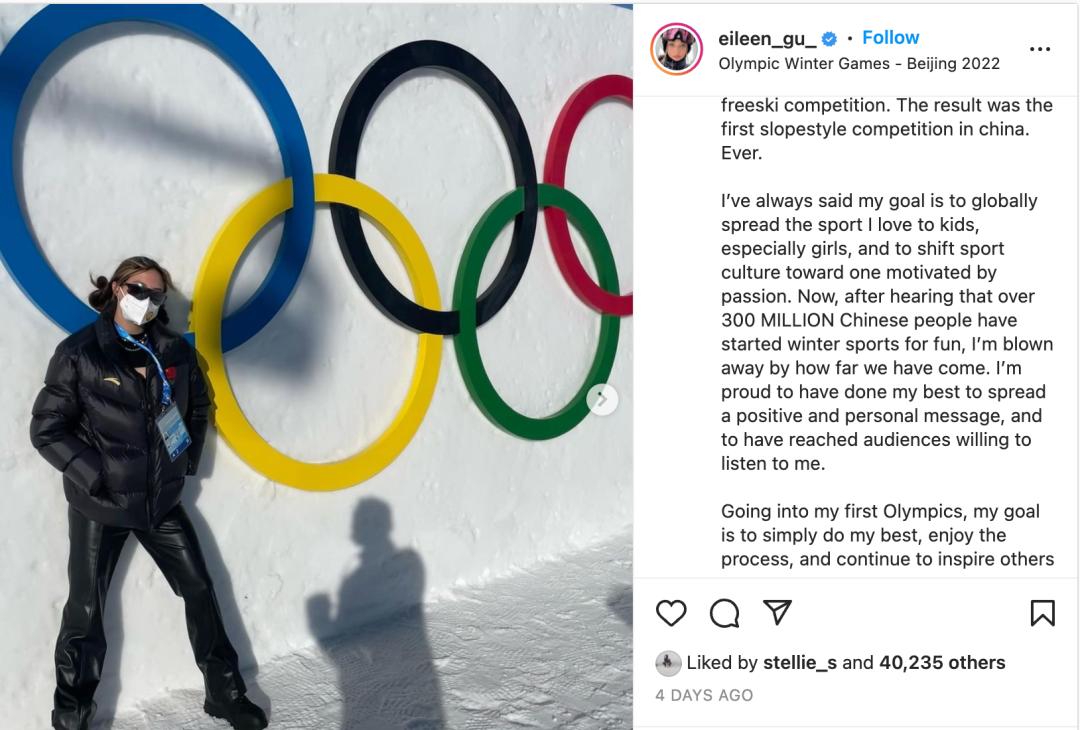 谷爱凌自己也不避讳这一点,她反复提到选择中国的一个原因,就是要在中国做冰雪运动的推广者。