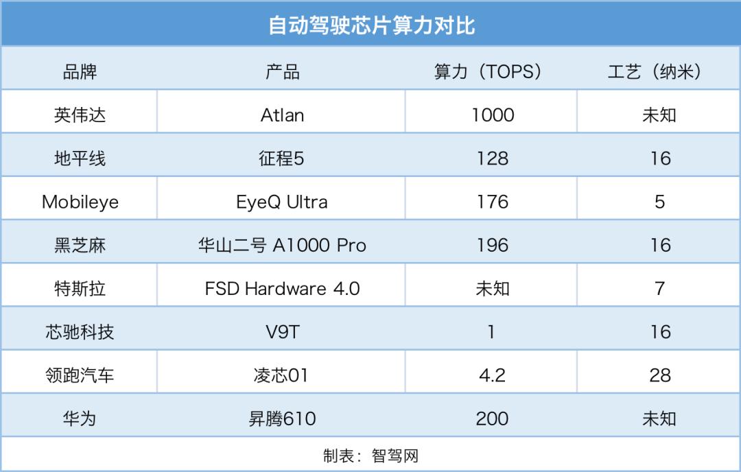 此前英伟达推出的Orin及Xavier是当下车企搭载的主流,7nm工艺的Orin芯片可实现200TOPS的运算性能,功耗仅为45W,采用12nm工艺的Xavier,算力为30TOPS,功耗仅为30W。
