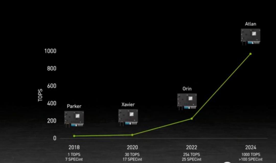 2021年4月12日,在英伟达发布会上,黄仁勋拿出了全新的自动驾驶SoC Atlan芯片,单颗SoC的算力能够达到1000TOPS,战力爆表。相比上一代Orin芯片算力提升近4倍,比大多数L4级自动驾驶车辆整车的算力还要强。