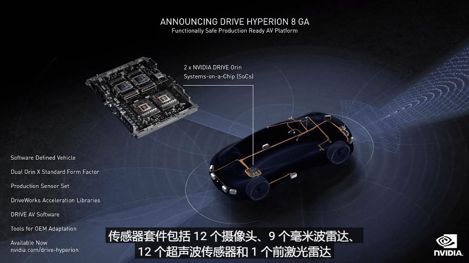 NVIDIA推出的自动驾驶测试和开发平台Hyperion 8拥有最新的完整硬件和软件架构,其传感器套件包括12个摄像头、9个雷达、12个超声波和一个前置激光雷达,所有处理均通过两个NVIDIA Orin 系统级芯片进行。