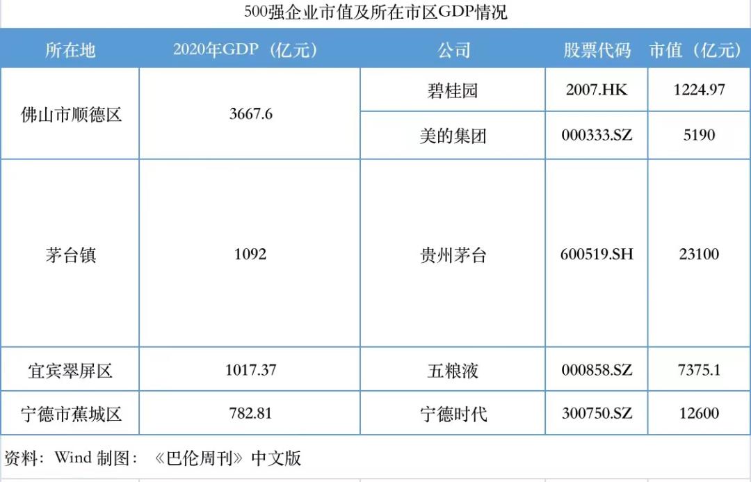 它们是、但不限于,北滘镇、茅台镇、漳湾镇,还有四川省宜宾市翠屏区。让这些小镇进入世界眼帘的是其拥有的上千亿甚至万亿市值的大公司,且都是上榜《财富》世界500强的公司。