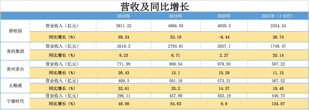 从已有公开数据对比2018年至2021年上半年五家企业的增长情况,不难看出,过去三年营收增速排名依次为碧桂园、宁德时代、五粮液、贵州茅台、美的集团。2021年上半年,宁德时代营收增速最快,同比增长134.07%。