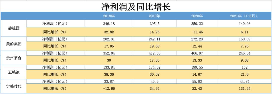 从净利润角度来看,2018年至2020年净利润增长最快的是五粮液、其余依次为贵州茅台、美的集团、宁德时代、碧桂园。2021年上半年宁德时代是净利润增速最快的企业,同比增长131.45%。