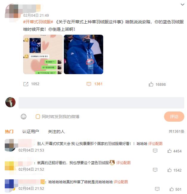 开幕式还没结束,就有网友发现了国际奥委会主席巴赫身上的安踏克莱因蓝羽绒服,并隔空喊话安踏上架相关产品,甚至有网友涌进安踏天猫官方直播间找主播求购。更早之前,中国自由式滑雪运动员谷爱凌在社交媒体晒出中国队服开箱视频时,也引发了广泛关注。