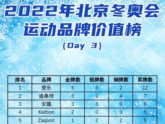 而截至2月7日,由体育大生意制作的《2022年北京冬奥会运动品牌价值榜》则显示,在前三个比赛日结束后,斐乐以5金5银2铜暂居榜首,迪桑特、安踏分别以7、6块奖牌数紧随其后。