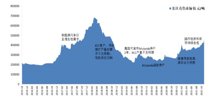图1:钴价走势(2015.10-2021.12) 来源:东兴证券