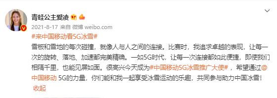 据谷爱凌微博,早在去年,谷爱凌就已成为中国移动5G冰雪推广大使。