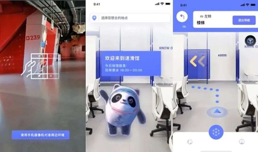 在张家口的冬奥村、国家速滑馆、鸟巢等场馆中,北京冬奥会运动员和工作人员可以体验精准的AR导航,通过手机App和摄像头识别周围环境锁定位置,输入目的地后,使用者跟随显示的AR虚拟箭头,就可以顺利找到想去的冬奥村的其他地点。这些导航应用背后是我们我们熟知的AI企业商汤、旷视。