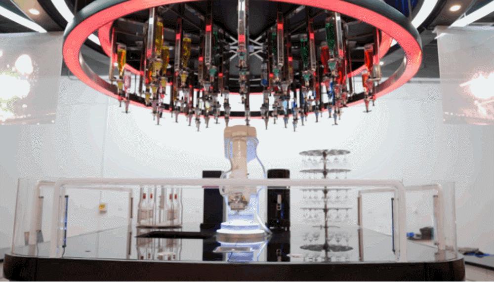 智能调酒机器人也毫不逊色,3-5分钟就可以制作出一杯好看好喝的鸡尾酒。