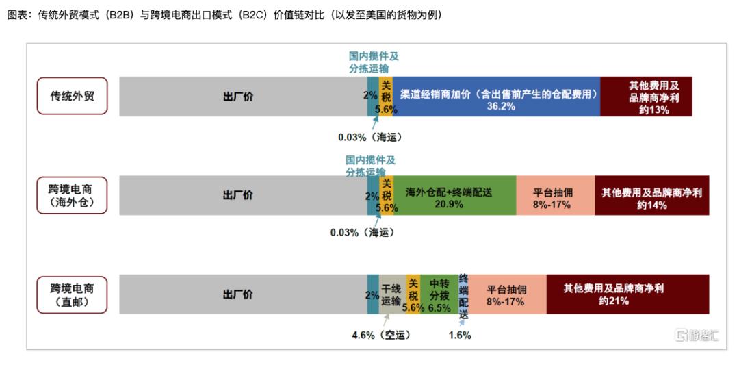 而若采取DTC模式,中国品牌则更可以实现利润的最大化。中金公司的研报指出,传统贸易模式下,经销商的价值占比约为36%,而在跨境电商直邮模式下,平台佣金费率约为8%至17%,远低于传统经销商加价率,中国品牌商价值量在跨境电商价值链上有近8%的提升空间,这些利润在传统模式下往往被经销商获取。
