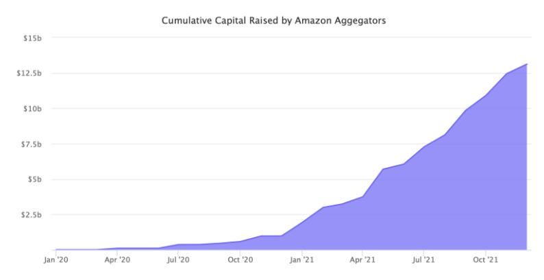 在2021年,这类公司受到了资本的热捧。根据Marketplaice Pulse的数据显示,亚马逊品牌收购公司在2021年筹集了超过120亿美元的资金,筹集的金额包括股权和债务融资。而在2020年,这一数字仅为10亿美元左右。