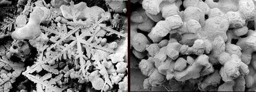 美国国家航空航天局(NASA)的科学家 Peter Wasilewsk 曾经研究过天然雪和人造雪的差别。这是他拍摄的照片——