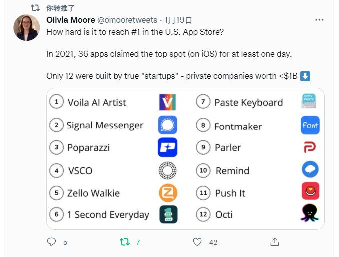 登顶过美国 iOS 下载榜 | 来源:Twitter 2021 年 12 款初创企业旗下的 App