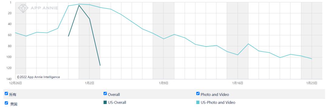 除了 2021 年一度登上榜首以外,App Annie 的数据显示 2022 年 1 月 1 日这天 「1second everyday」 又一次登上了美国 iOS 免费下载总榜的第 6 位。